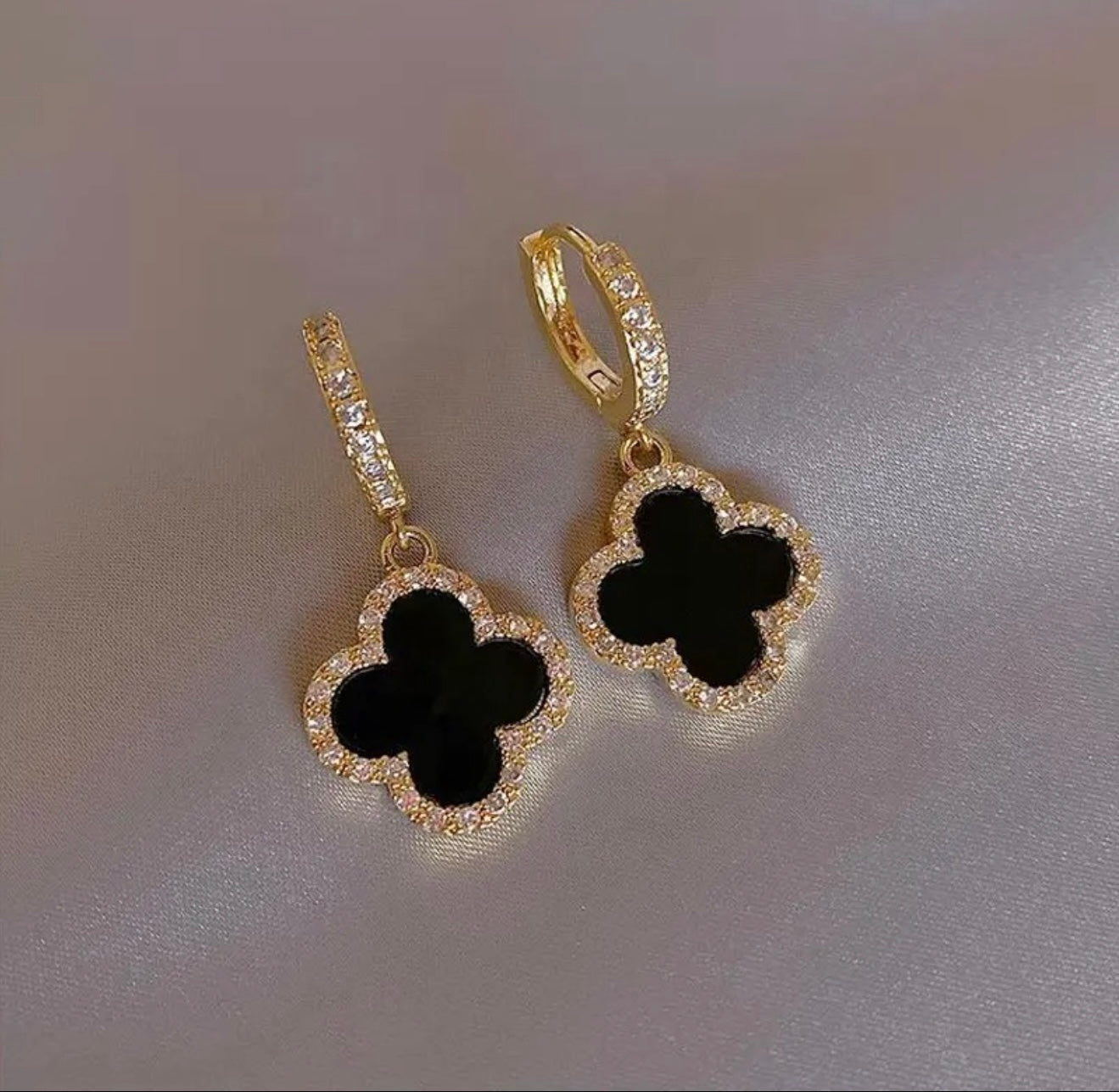 Add a touch of timeless elegance to your ensemble with these sophisticated drop earrings. Featuring a sleek black clover pendant outlined in sparkling gold and delicate cubic zirconia accents along the hoop, these earrings offer a refined and versatile style.