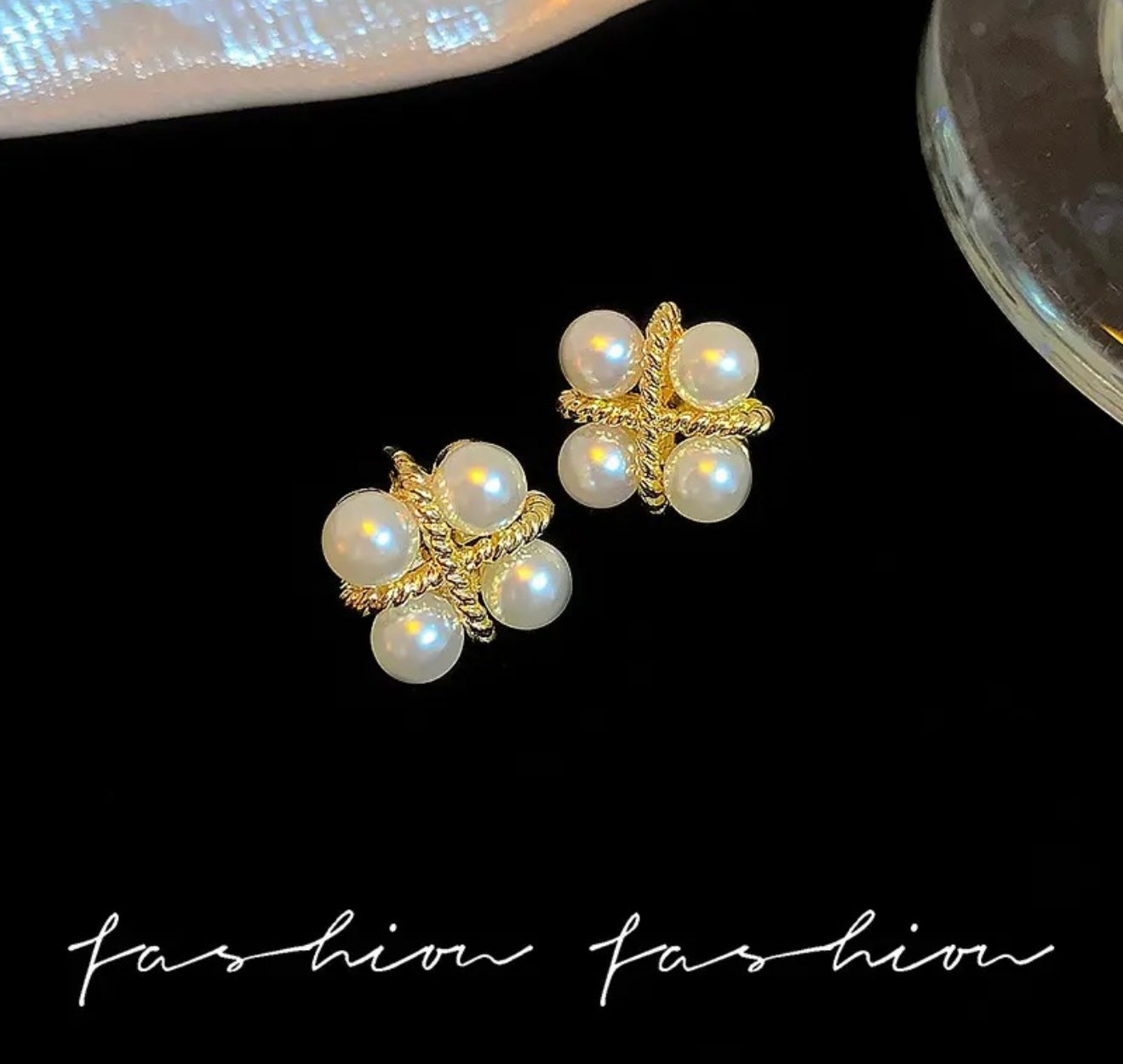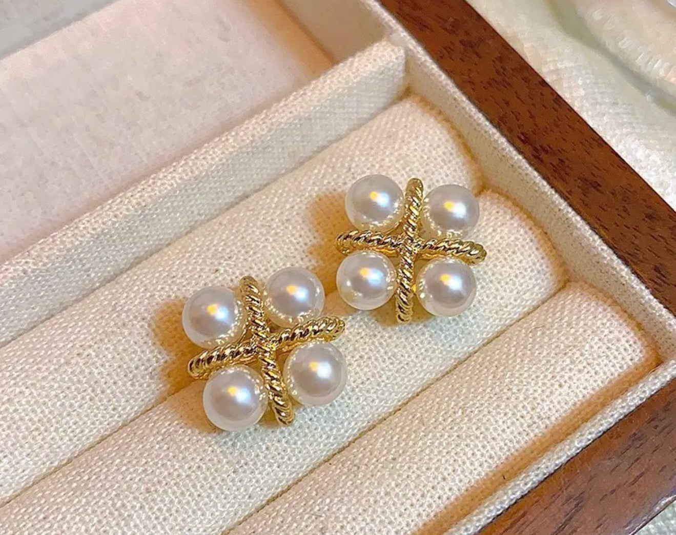 A sophisticated and timeless pair of stud earrings featuring a delicate cluster of pearls. Each earring is designed with four lustrous pearls arranged in a chic, flower-like shape. The pearls are bound together by a twisted gold-toned metal wire, creating a rich texture that adds a touch of classic elegance. These earrings are a versatile accessory, perfect for adding a refined and graceful finish to any outfit, from a professional look to an evening ensemble.
