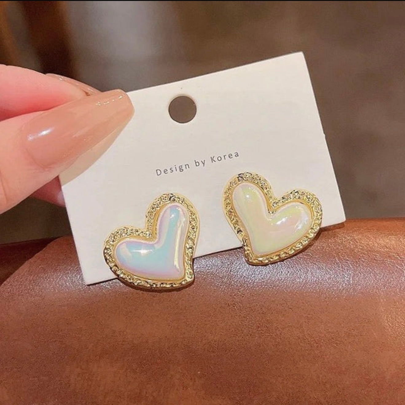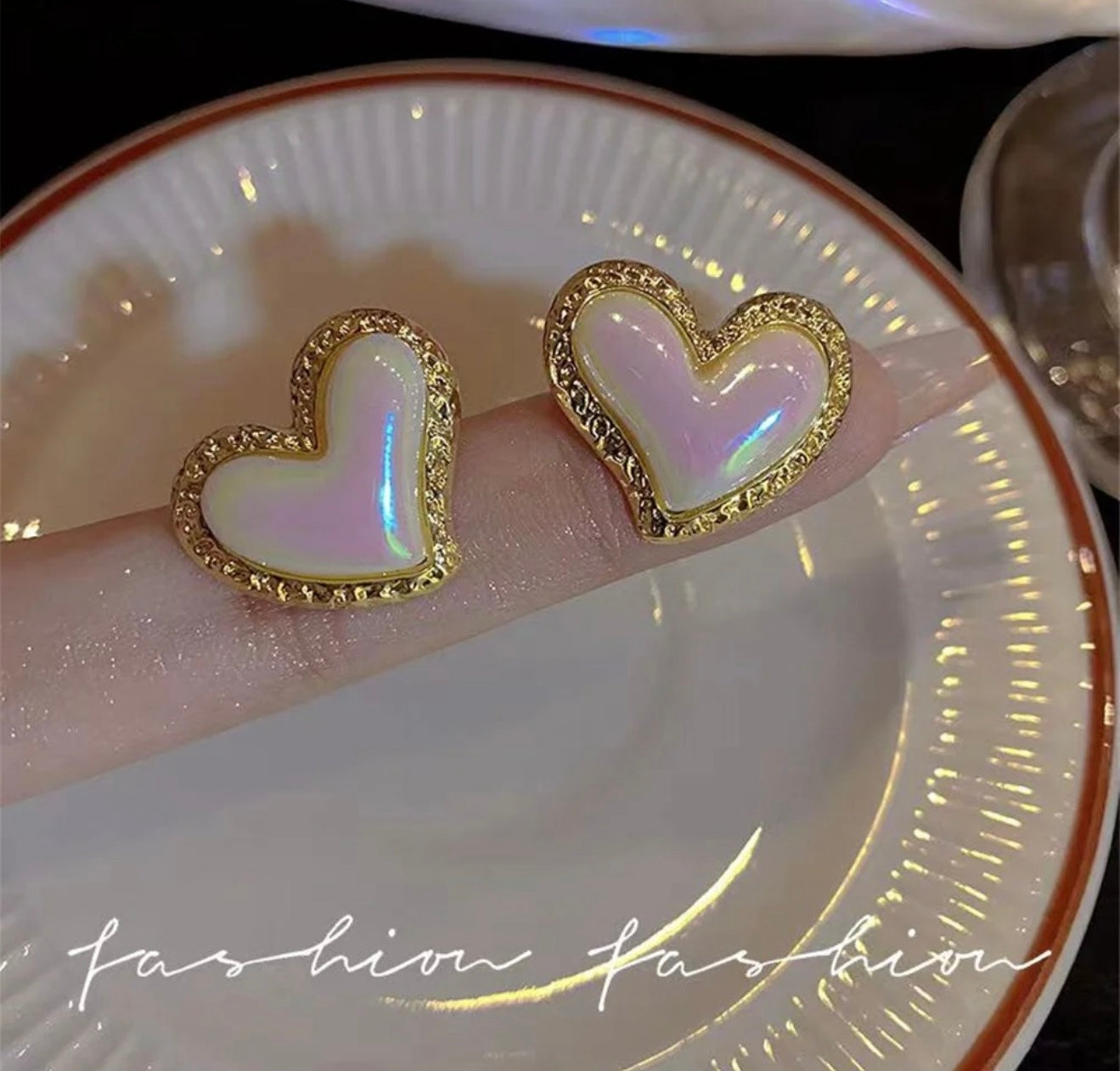 A pair of charming stud earrings in a heart shape. The center of each heart features an iridescent, pearl-like material that shimmers with soft pink, blue, and white tones. The edges of the hearts are framed in a gold-toned metal, which is adorned with a delicate row of tiny, sparkling stones, likely cubic zirconia or rhinestones. The earrings are displayed on a translucent, crystalline surface, giving them a magical and elegant appearance. These earrings are a romantic and whimsical accessory, perfect for adding a touch of sparkle to any outfit.