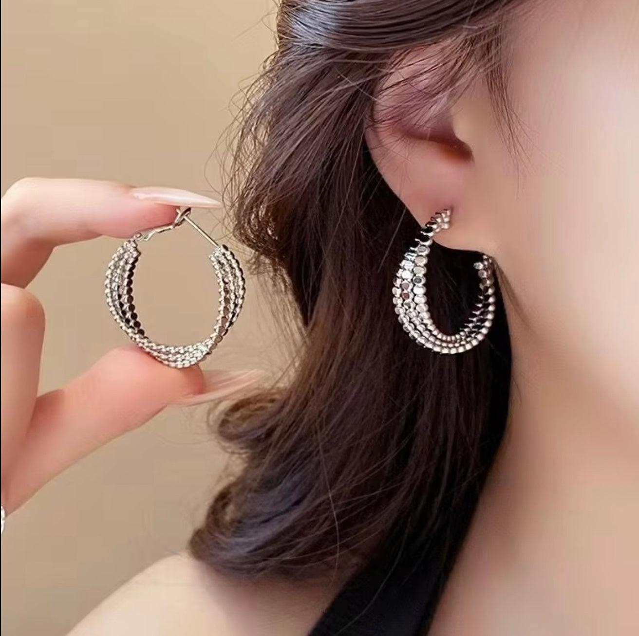 Elevate your look with these stunning gold and silver toned hoop earrings. Featuring a unique triple-band design, each band is intricately textured with small, shimmering beads, creating a rich and luxurious visual appeal. These versatile hoops offer a contemporary twist on a classic style, perfect for adding a touch of sophisticated glamour to any ensemble.