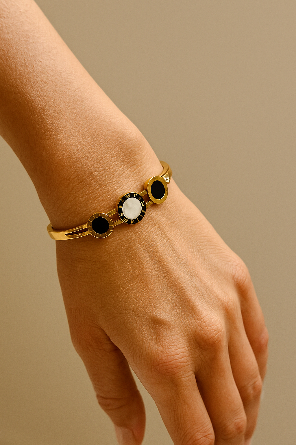 Elevate your wrist with this stylish gold cuff bracelet, adorned with alternating black and white enamel discs showcasing elegant Roman numerals. Its sleek design makes it perfect for both everyday wear and special occasions.