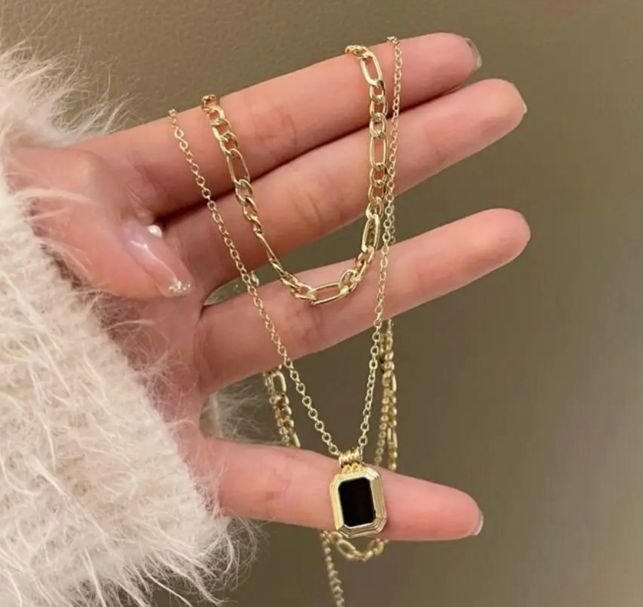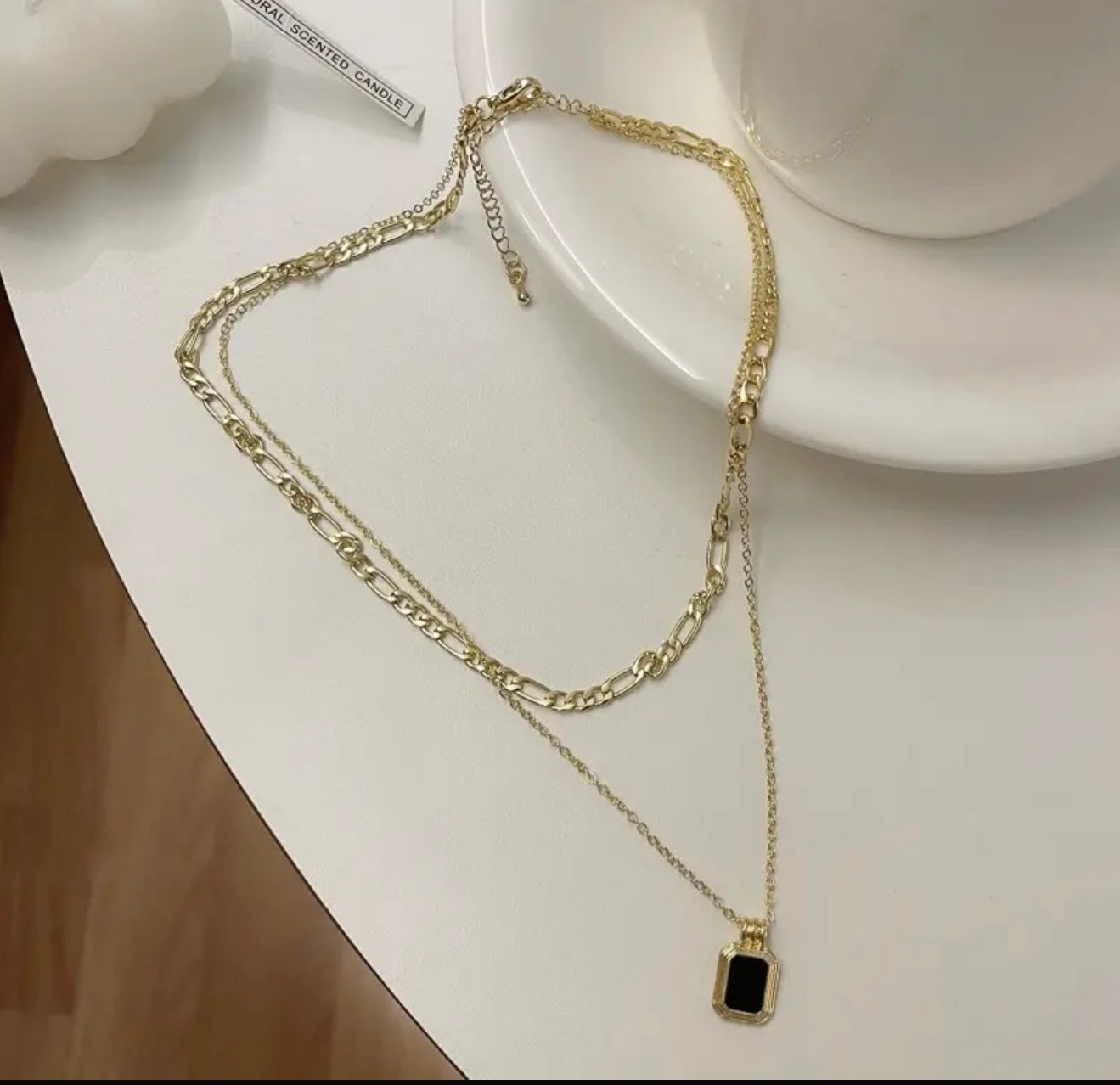 Elevate your style with this chic gold layered necklace set, featuring a bold curb chain paired with a delicate chain showcasing a striking black rectangular pendant. This versatile two-in-one design adds effortless sophistication to any outfit, from casual daytime looks to elegant evening ensembles. Crafted with a polished gold finish, the necklace includes an adjustable clasp for a customized fit. Perfect for layering lovers and minimalists alike.
