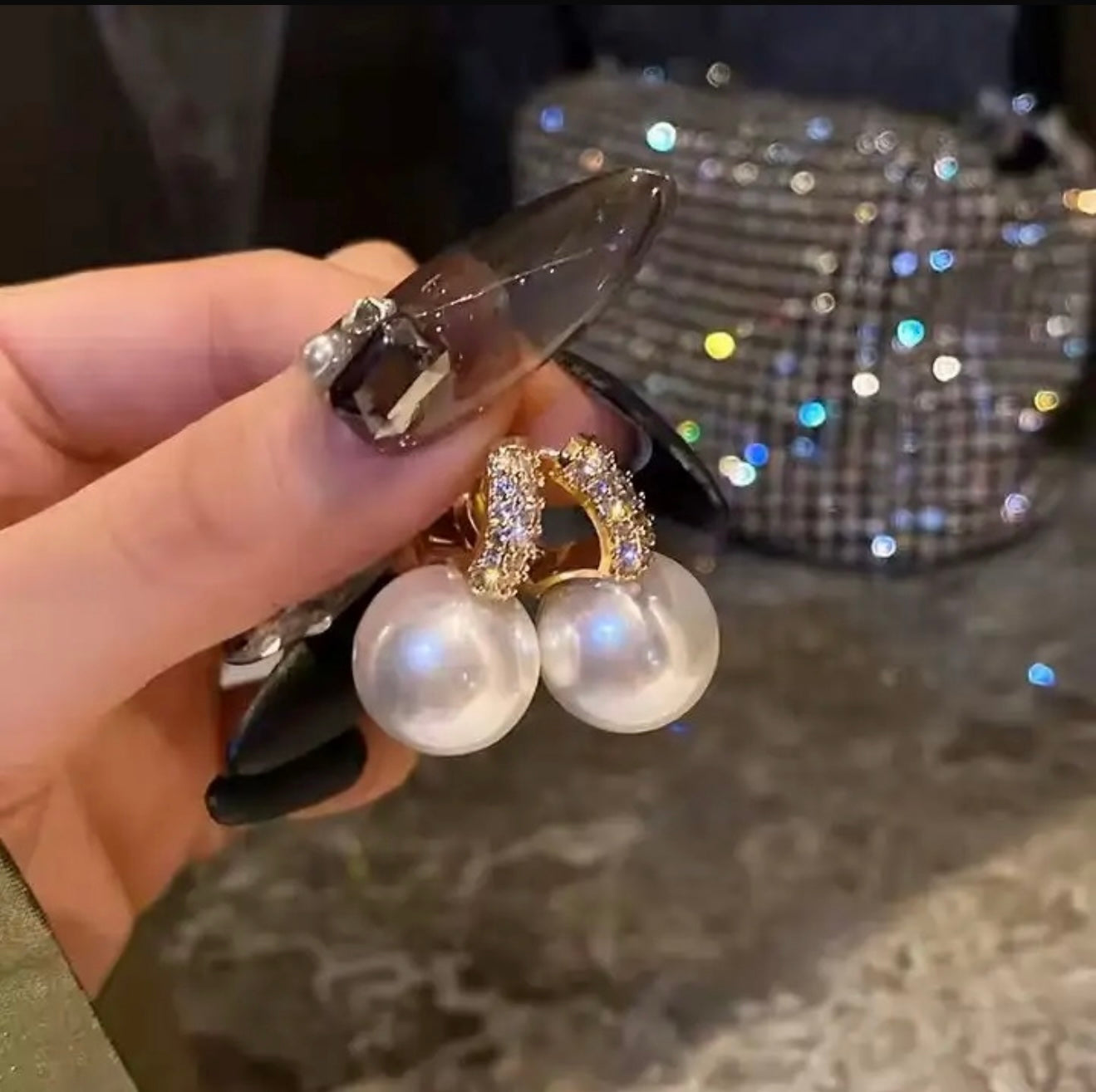 These exquisite earrings feature a lustrous gold-plated mini-hoop, beautifully embellished with a row of sparkling pave-set American Diamond stones. Dangling gracefully from each hoop is a large, classic white pearl, adding a touch of timeless elegance. Perfect for both sophisticated evening wear and elevating your everyday look, these modern pearl earrings combine classic charm with contemporary design.