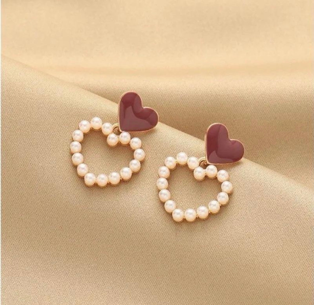 Elegant earrings featuring a deep red heart charm suspended above a delicate heart outline made of small, lustrous pearls.
