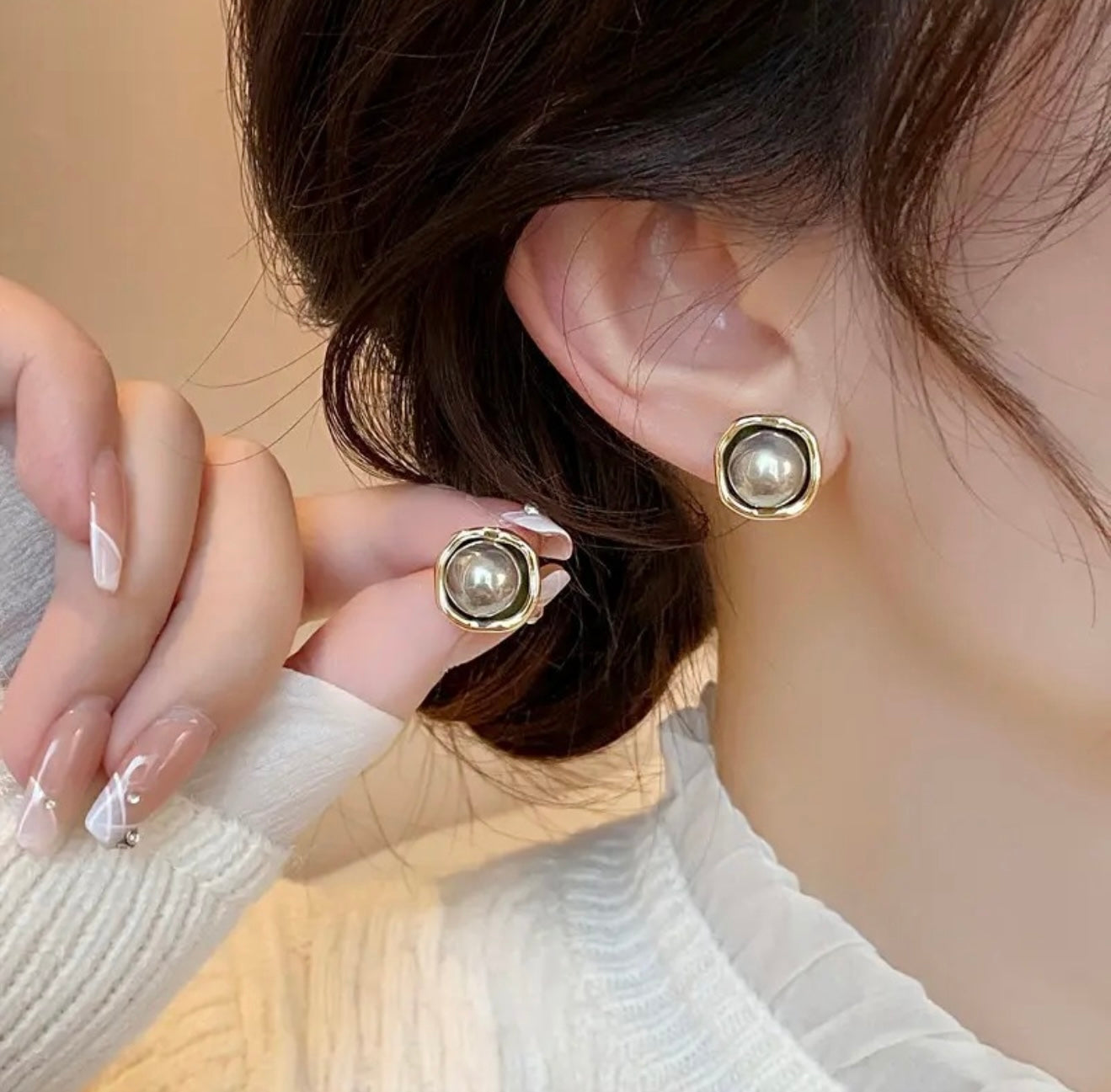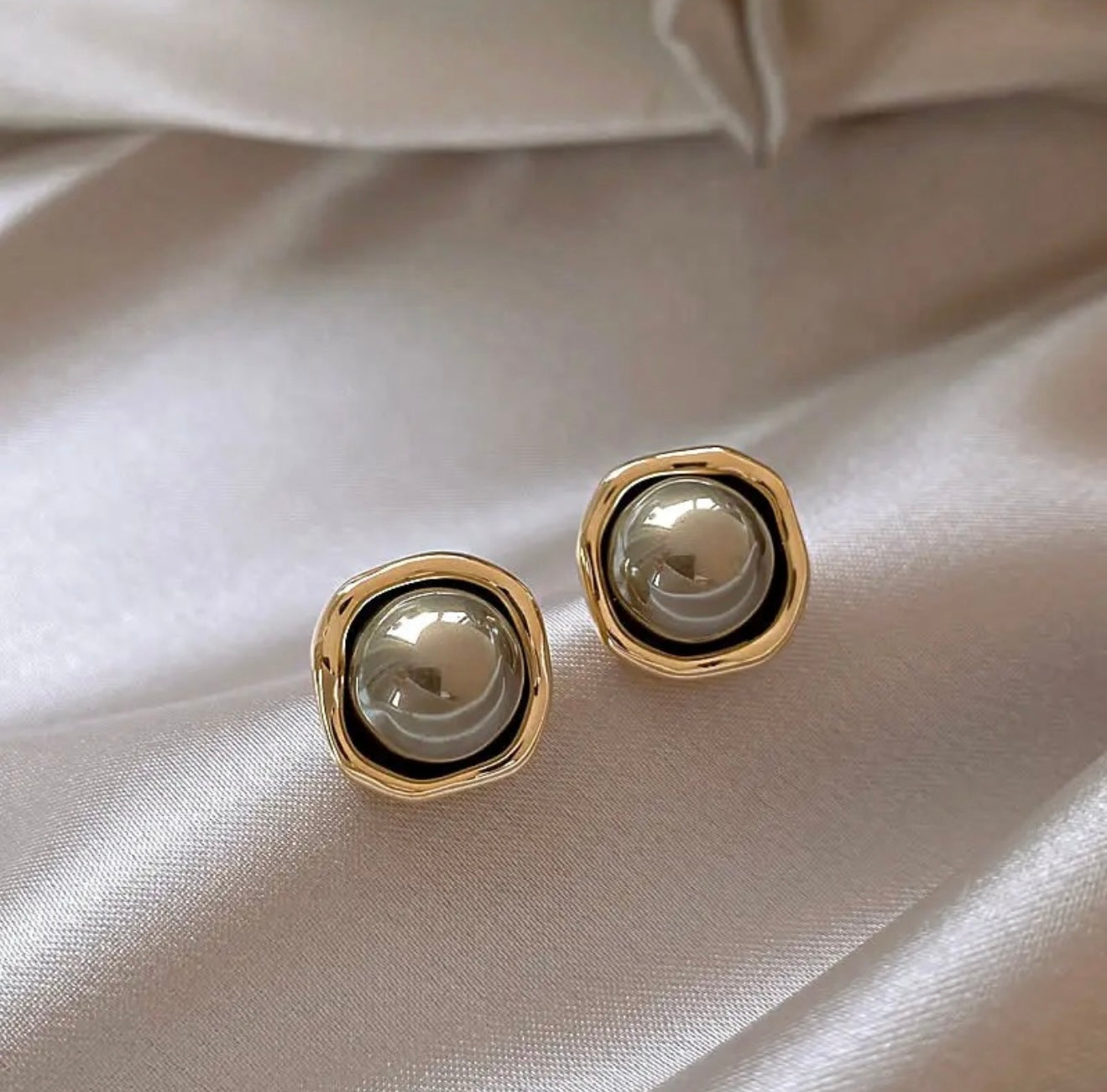 Adorn yourself with the distinctive beauty of these luminous grey pearl stud earrings. Each earring showcases a perfectly round pearl, exuding a gentle glow and rich hue, set within a striking, organically shaped gold-tone bezel. The irregular frame provides a modern contrast to the classic pearl, creating a statement piece that is both timeless and contemporary. Perfect for those who appreciate unique design and understated luxury.