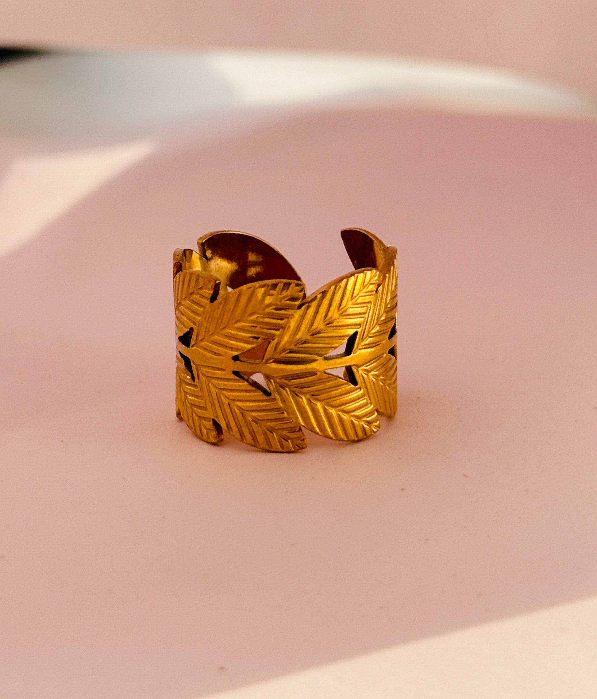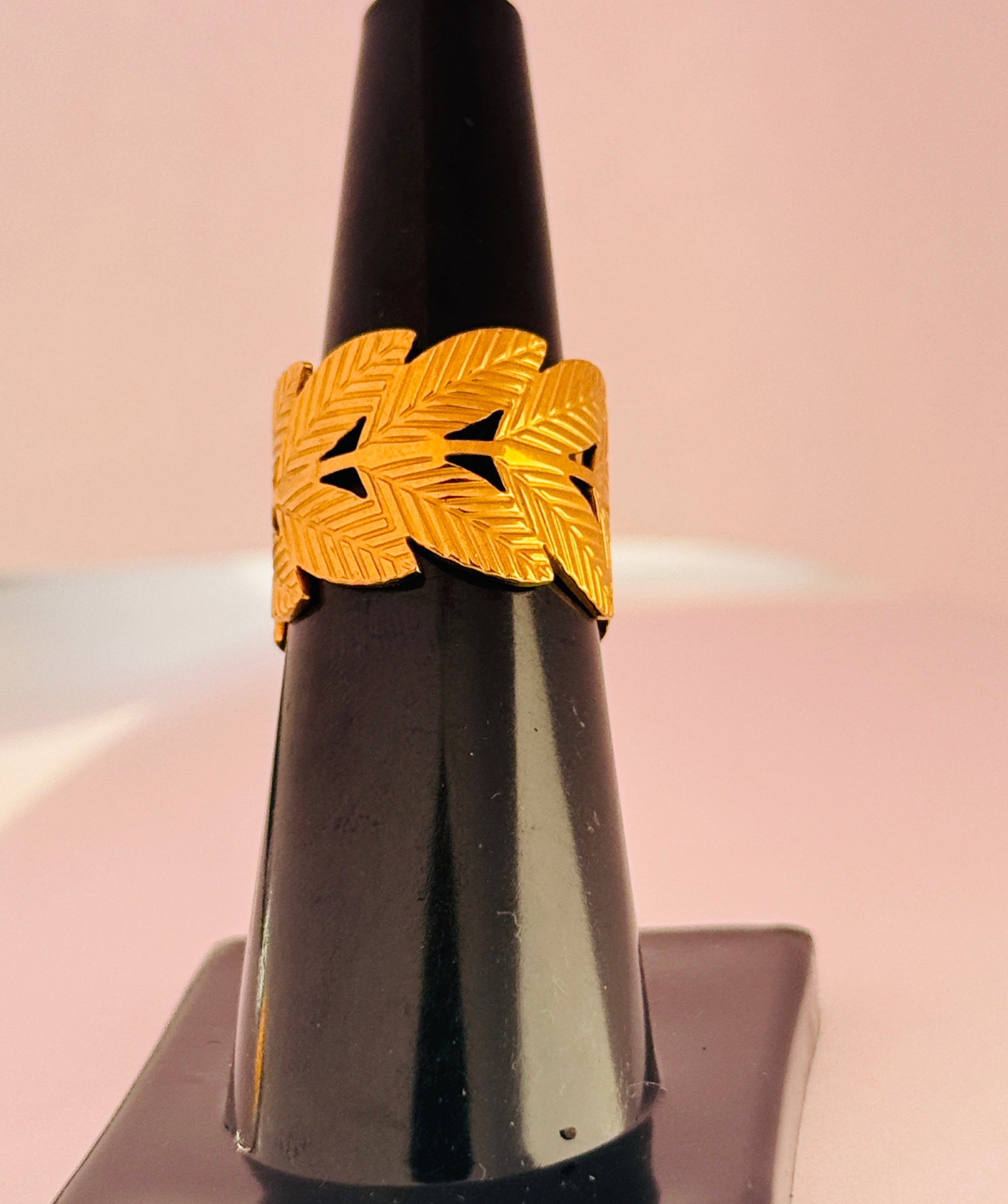 Add a touch of natural elegance to your jewellery collection with this stunning gold-toned leaf ring. The intricately detailed feather design wraps gracefully around your finger, creating a bold yet sophisticated statement piece. This adjustable cuff-style ring features beautifully crafted leaf motifs with delicate veining patterns that catch and reflect light from every angle. The wide band design makes it a striking standalone accessory that commands attention. Perfect for both casual and formal occasions, this versatile ring adds a nature-inspired glamour to any outfit.