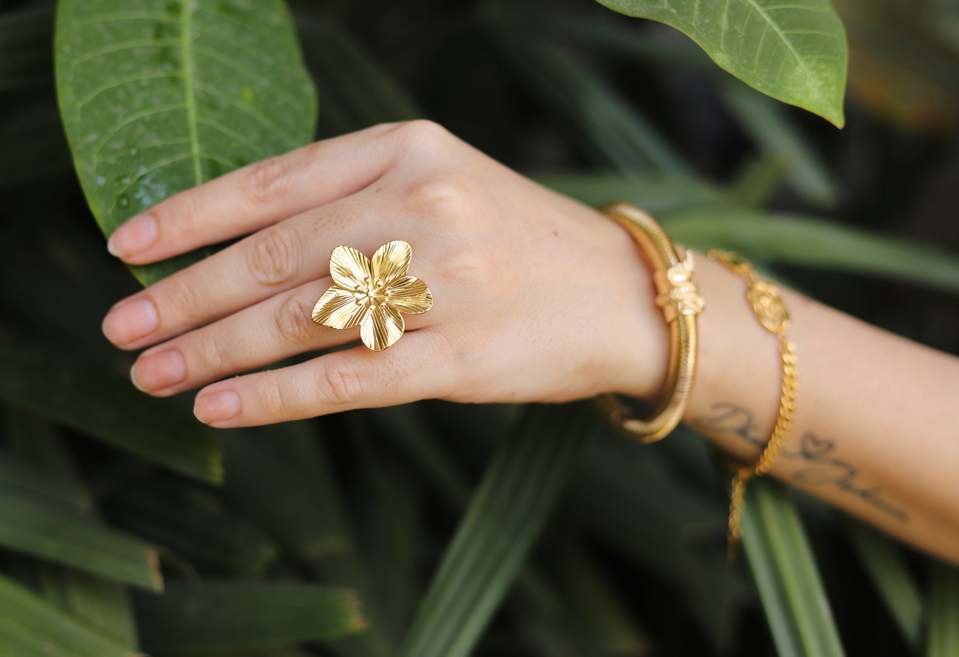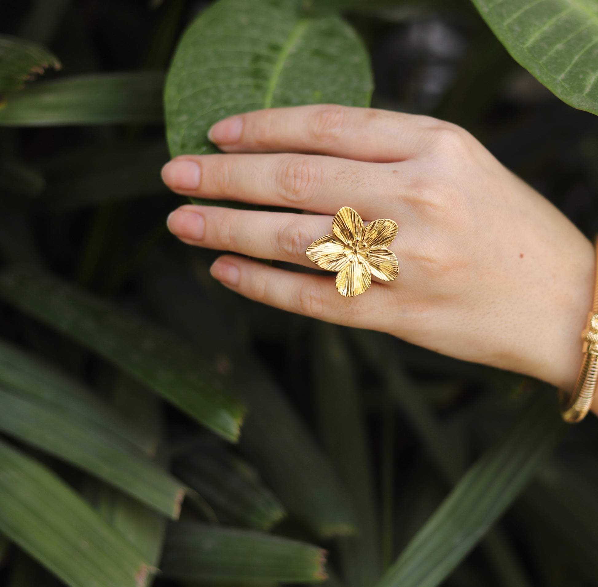 Let your style flourish with the Golden Bloom Ring — a striking floral design crafted in a radiant gold fini...
