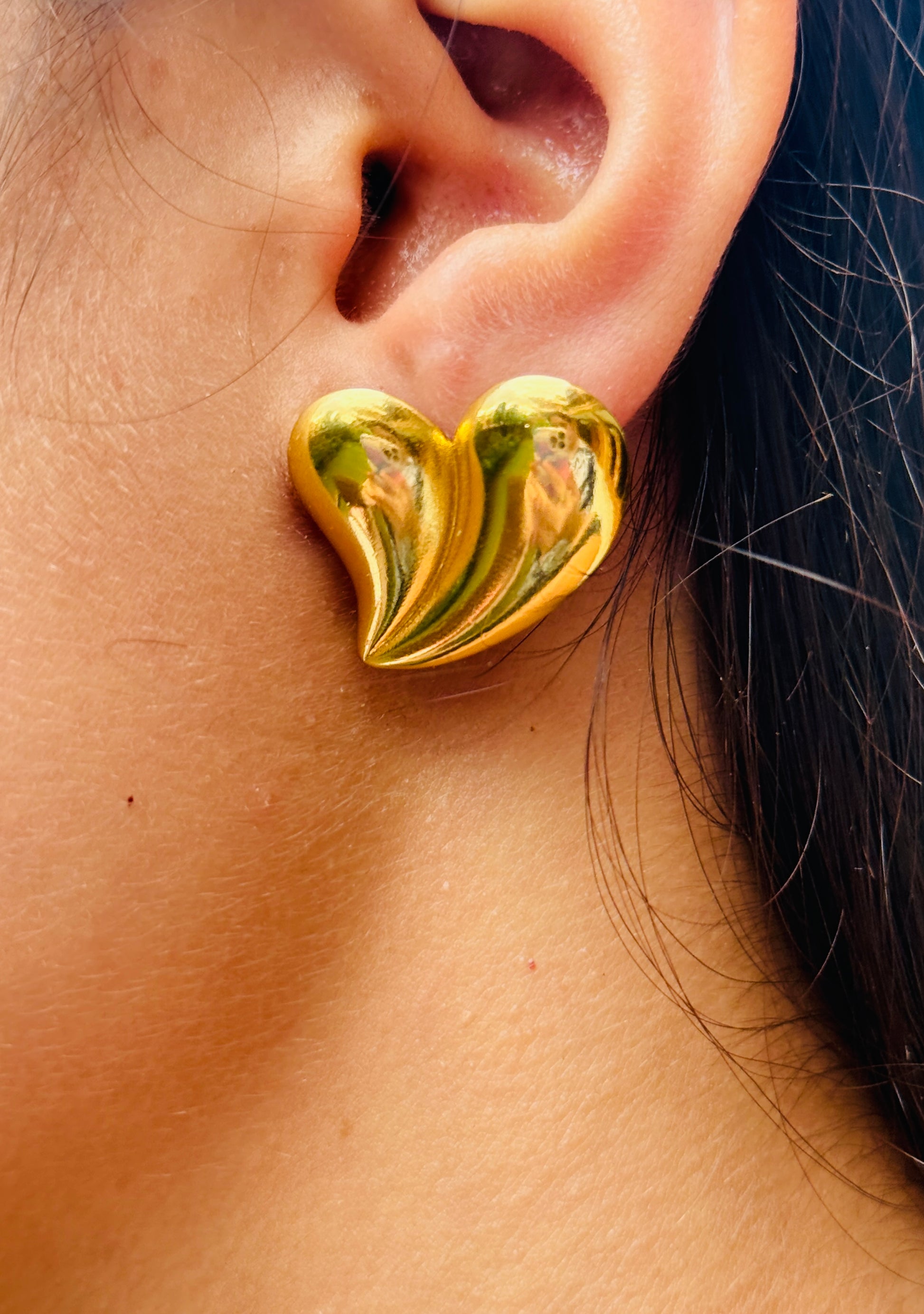 These elegant stud earrings feature a sleek, stylized heart shape with a high-shine polished gold finish. Their smooth, reflective surface catches the light beautifully, offering a timeless and sophisticated touch to any outfit. Perfect for adding a subtle hint of romance and luxury.