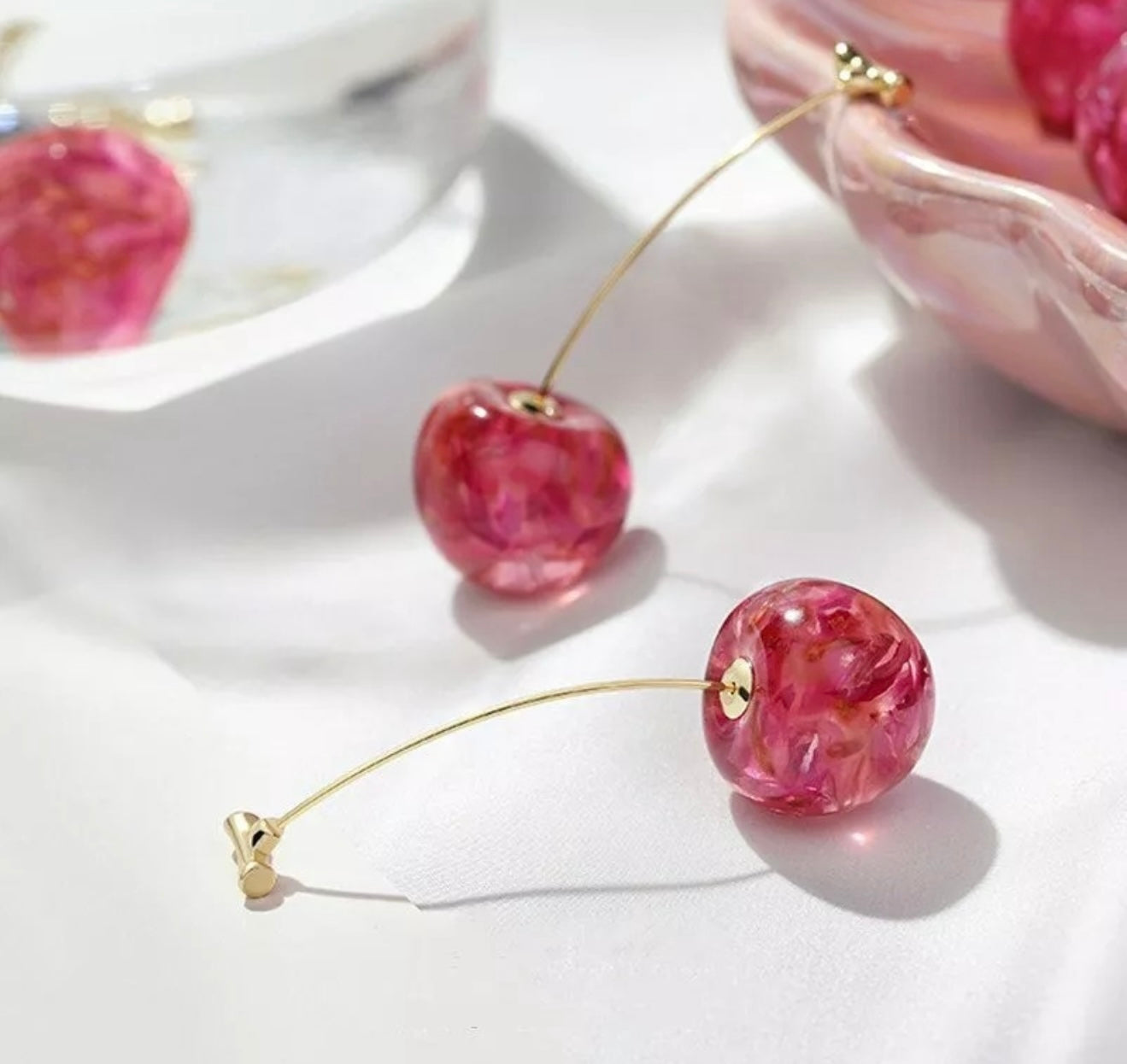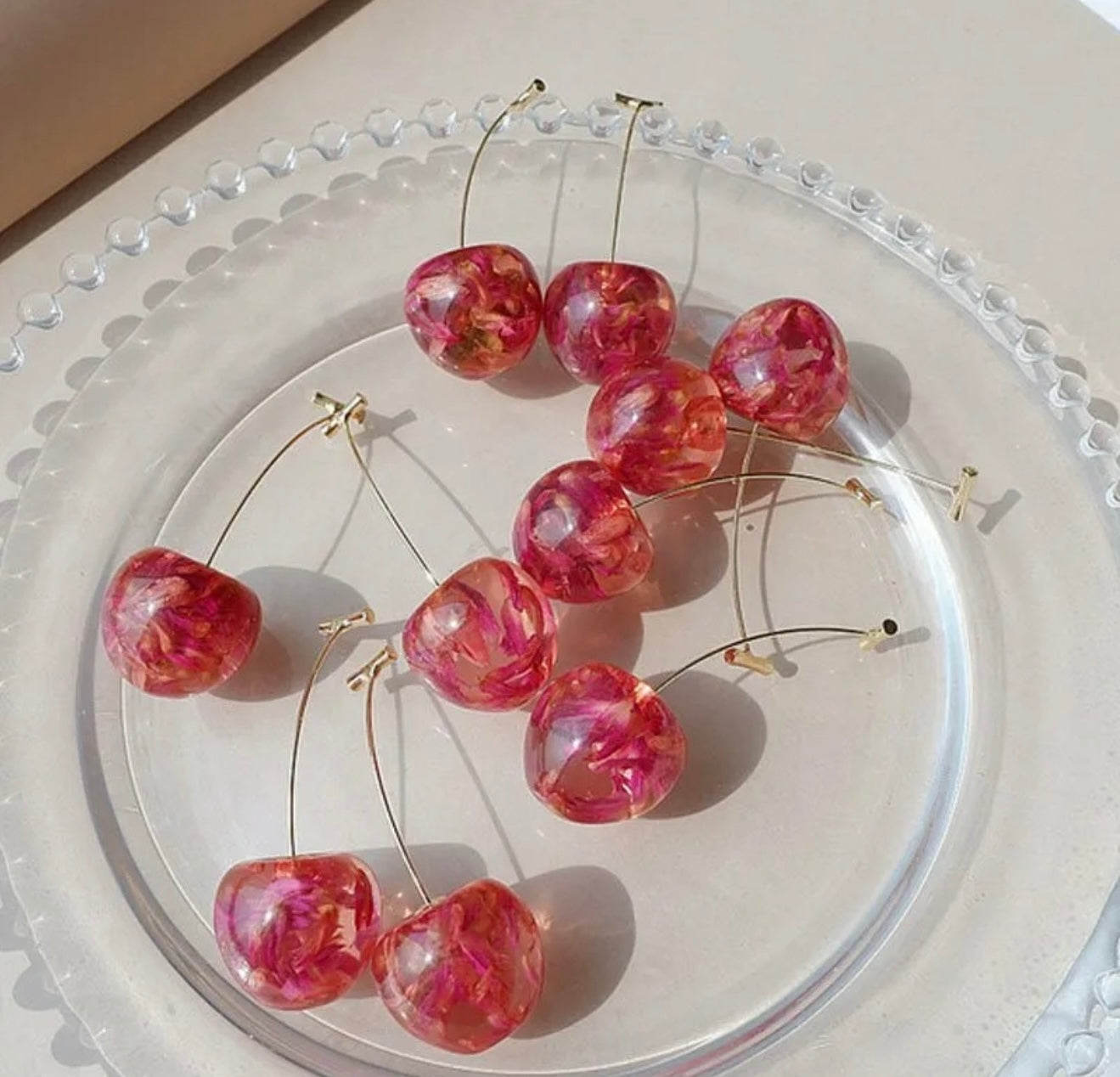 Add a touch of playful elegance to any outfit with these delightful cherry-inspired drop earrings. Featuring vibrant, resin-encased blossoms, they're a charming statement piece for any occasion.