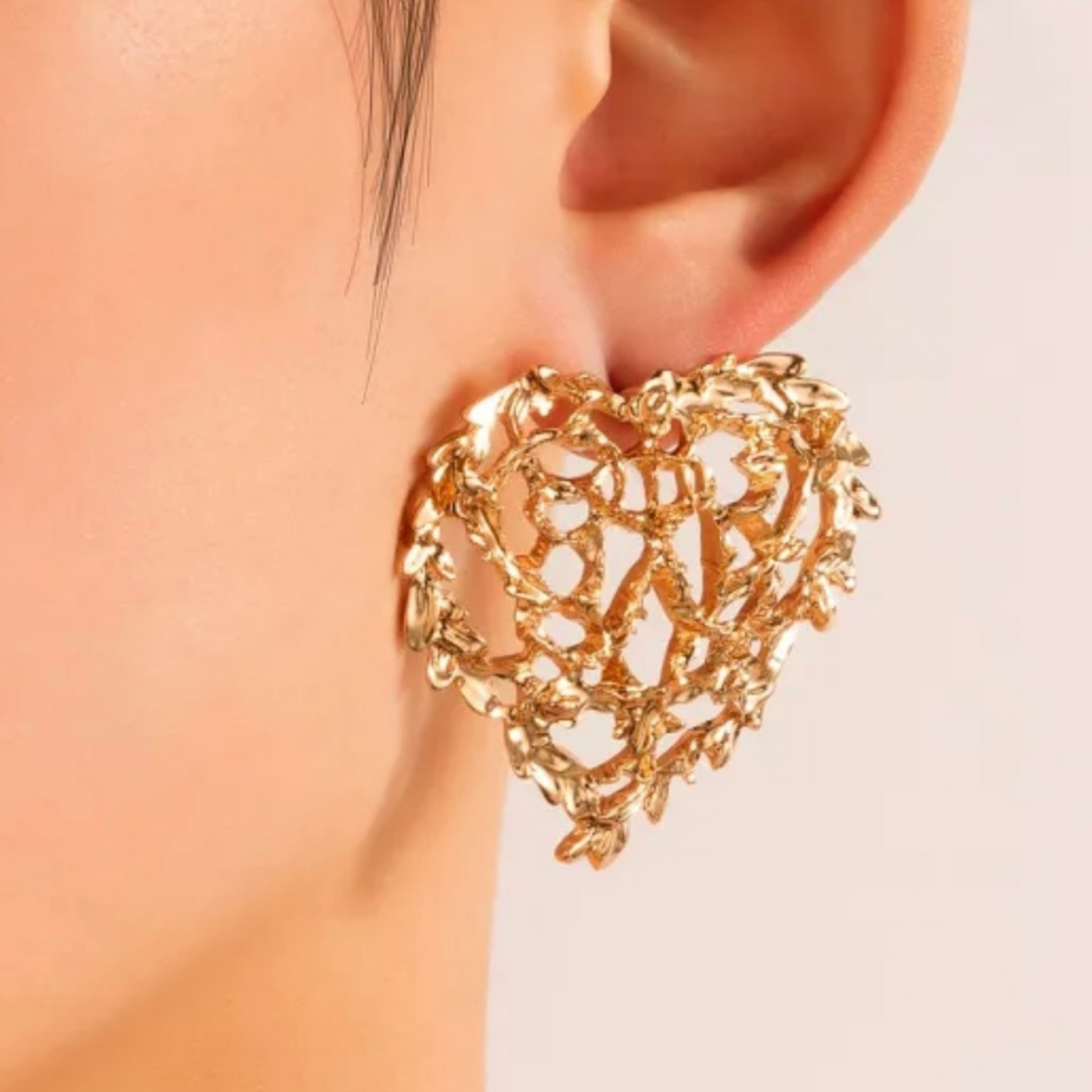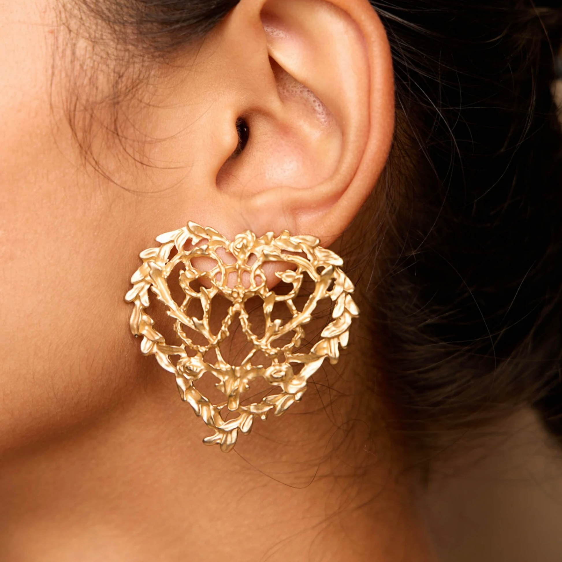 Celebrate love and craftsmanship with these Intricate Filigree Heart Stud Earrings, designed in a stunning matte gold finish. Featuring a delicate vine and leaf motif forming a romantic heart shape, these earrings exude vintage charm with a modern twist. Lightweight and timeless, they’re perfect for everyday elegance or as a thoughtful gift for someone special.